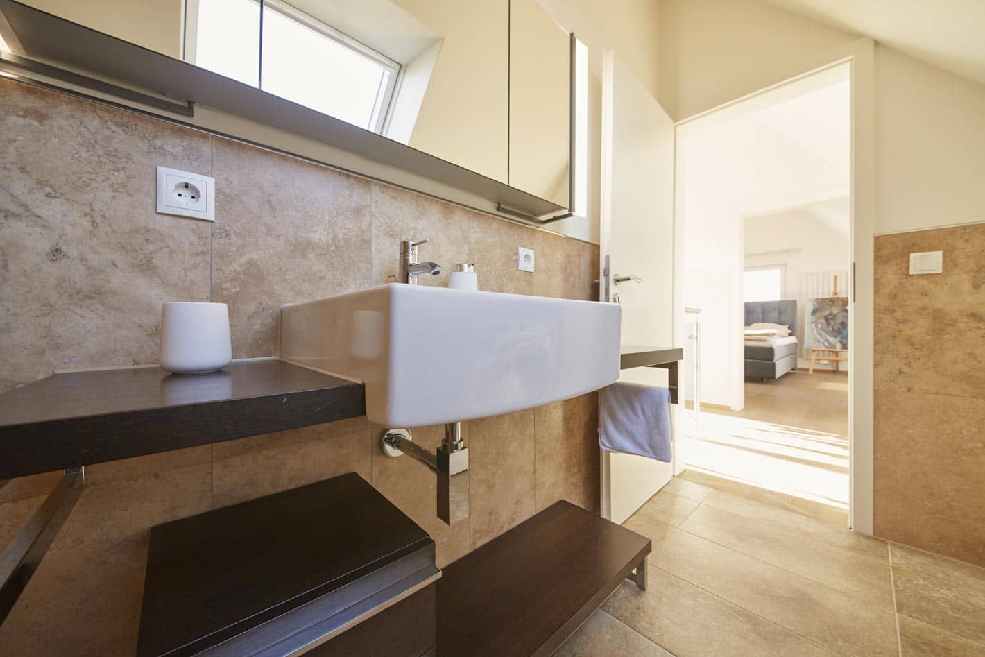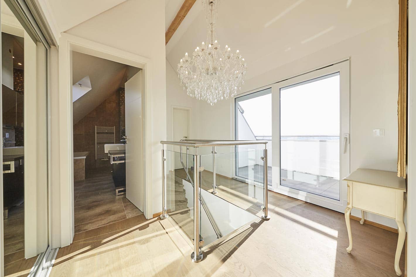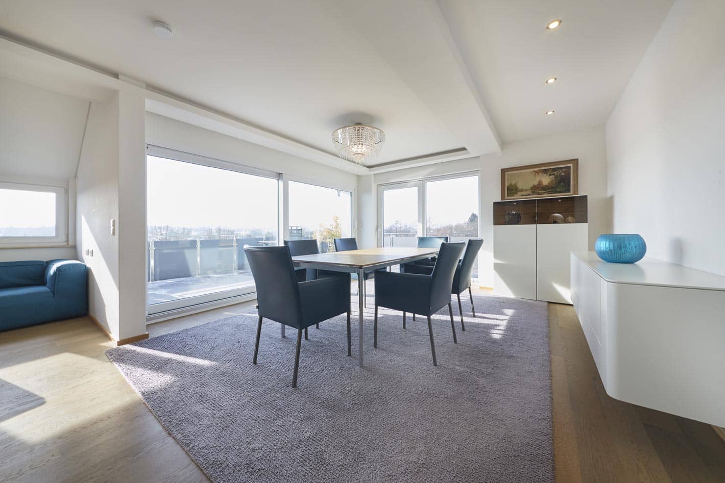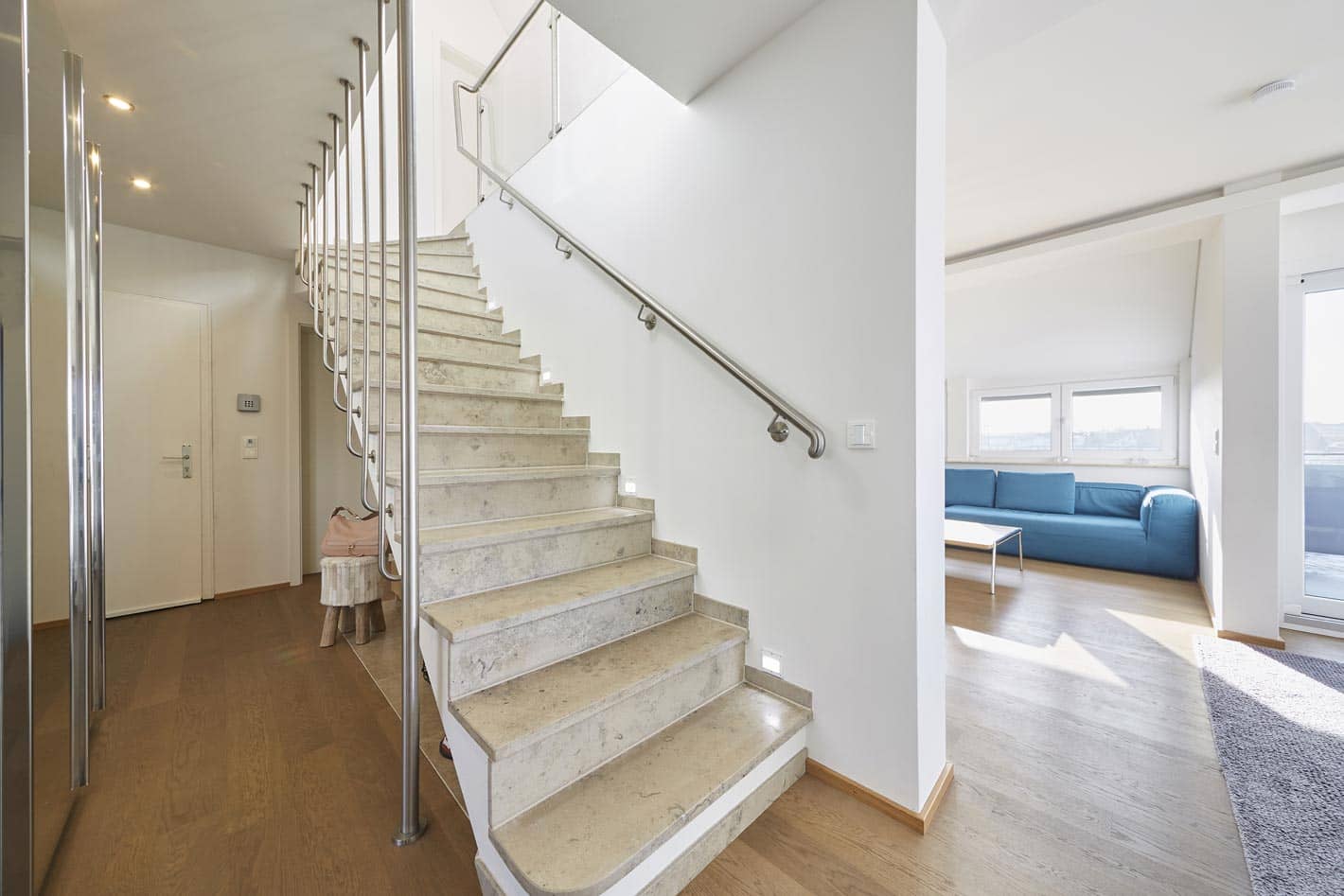 Die Terrassenerweiterung ermöglicht eine 180 Grad Blick-Winkel in die grünreiche Wohngegend und einen faszinierend schönen Sonnenuntergang. Aus der einfach gehaltenen Dachgeschosswohnung entsteht eine luxuriöse Residenz, in der hochwertige Materialien wie Jura, Travertin und Granit ein Muss sind. Mit Liebe zum Detail wurde das Wohnungskonzept unter Beachtung einer effizienten Raumausnutzung und hohem Komfort auf beiden Etagen, ausgearbeitet. Durch Schaffung des Dachausschnitts in der zweiten Etage der Wohnung wurde der Lichteinfall optimiert und gleichzeitig ein zweiter uneinsehbarer Verweilort für schöne Sonnenuntergänge geschaffen.
