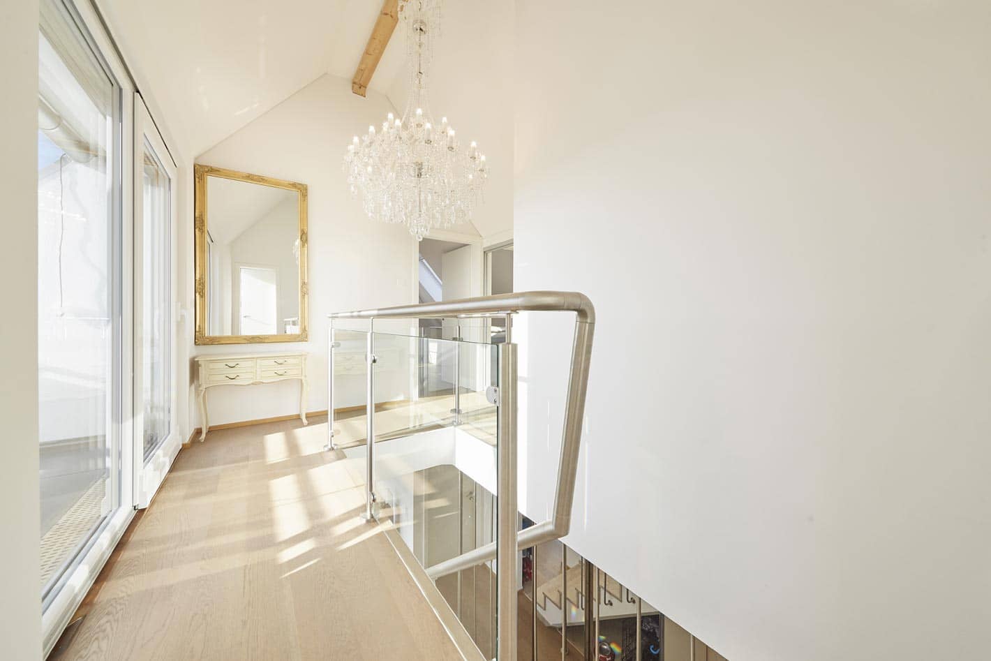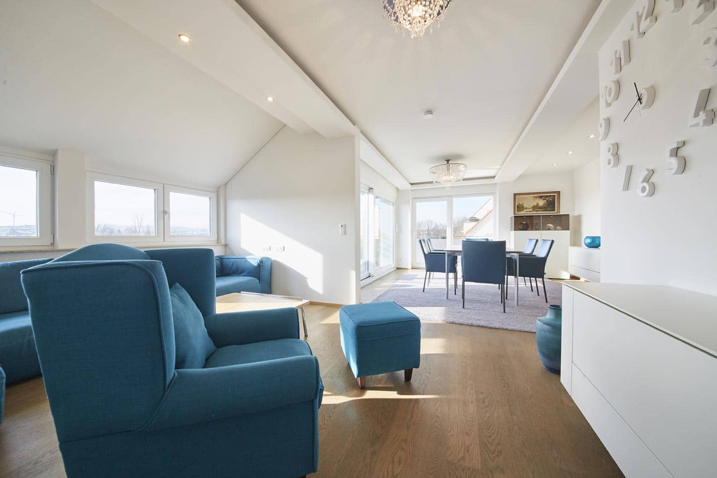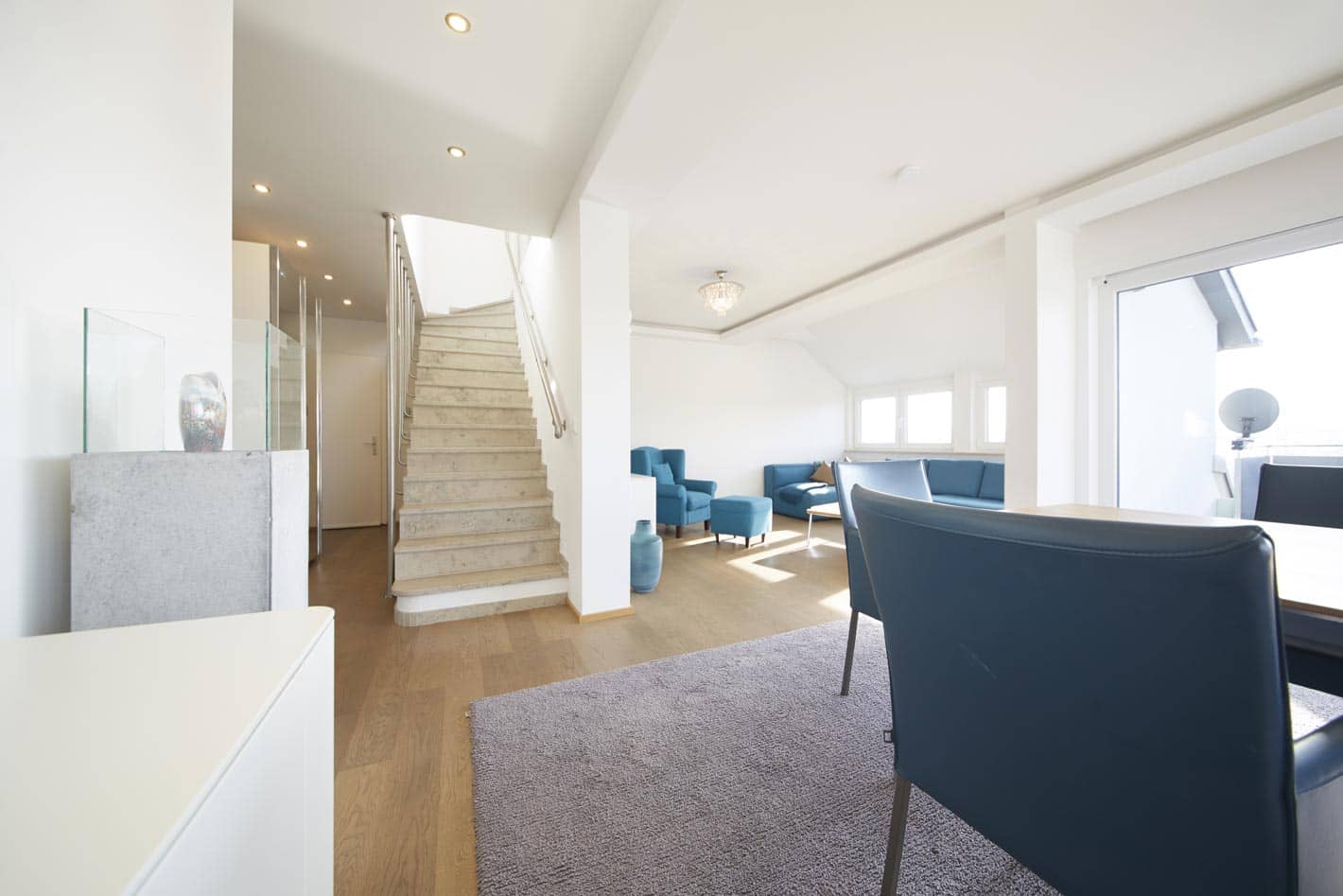 Sanierung und Ausbau einer 5-Zimmer-Maisonettwohnung mit 130 qm und der dazugehörigen Garage. Die drei Zimmer-Wohnung aus den 70er Jahren mit einem Panoramaausblick in das Stuttgarter Naturschutzgebiet Körsch wurde vollständig entkernt, um das zweite Dachgeschoss erweitert und zu einer 5-Zimmer-Maisonettwohnung ausgebaut.