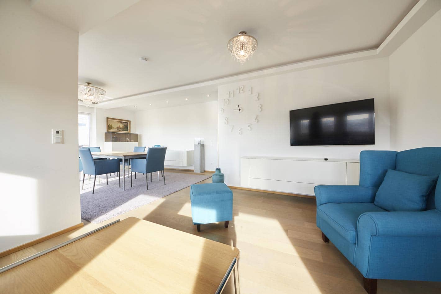 Im Zuge der Elektrikerneuerung wurde ein Bus-System eingeführt und die Wohnung zu einem Smart-Home mit einer zentralen Steuerung sämtlicher elektrischer Vorgänge im Haus umgebaut, von der Lichtregelung, Rollläden- und Temperatursteuerung bis hin zum Fernseher und Überwachungskamera. Damit kann das neue Zuhause von überall auf der Welt durch den Eigentümer gesteuert und überwacht werden.